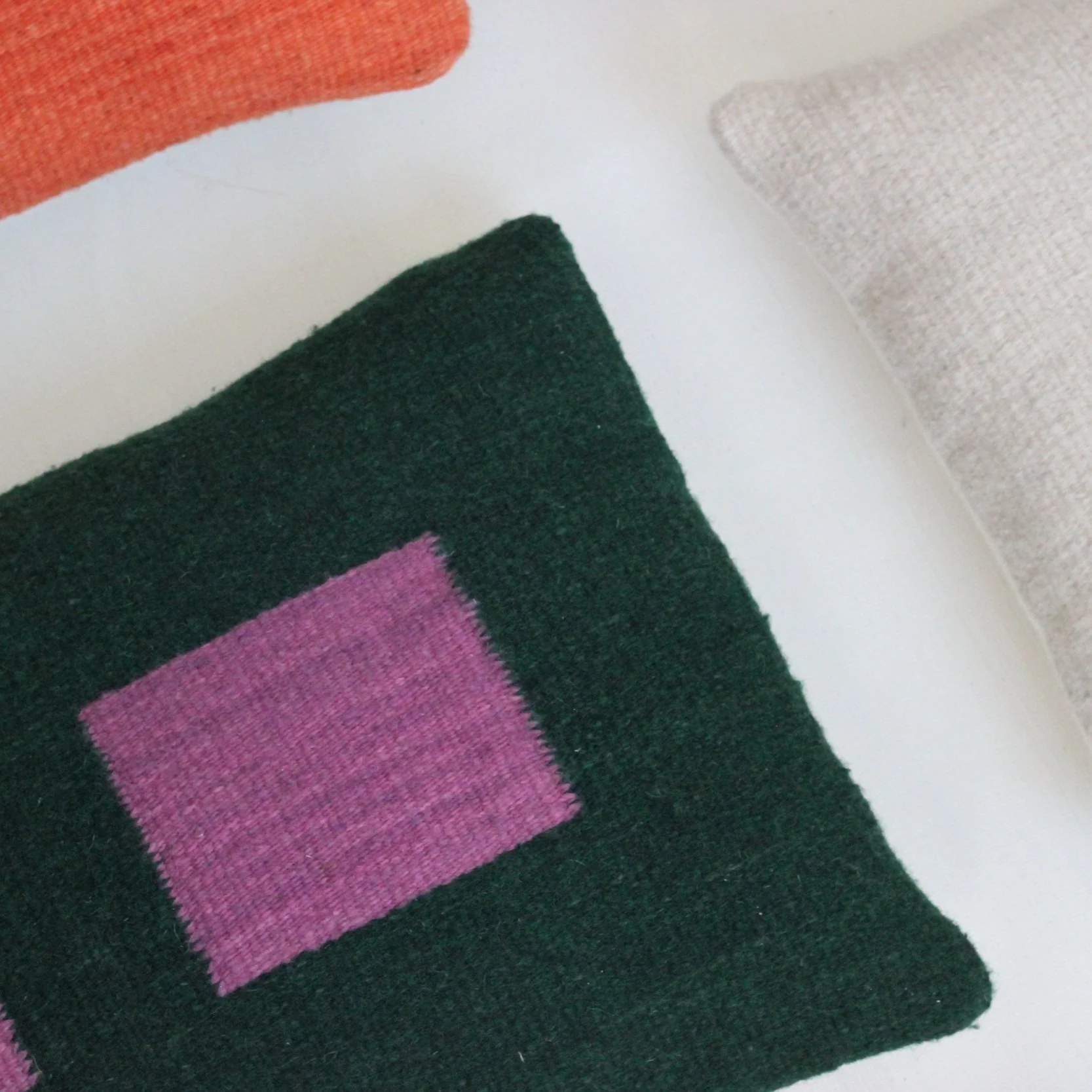 The pillow collection is inspired by the work of Josef and Anni Albers, Sophie Taeuber-Arp and Luis Barragán. Focusing on the interaction of color and scale and fusing traditional weaving techniques with modernist design principles, each design is created using a layering of squares to create a visual dialogue between colors.